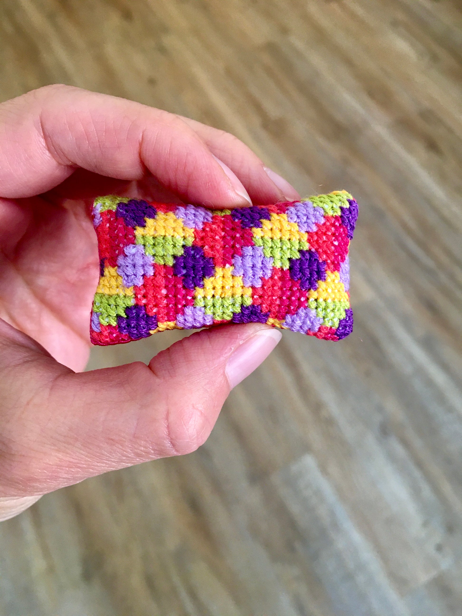 Add a splash of color and charm to your doll’s space with this beautifully hand‑embroidered mini pillow. The front features bold geometric patterns in vivid, saturated hues, while the back is crafted from smooth deep fuchsia satin – adding a touch of luxury and elegance.